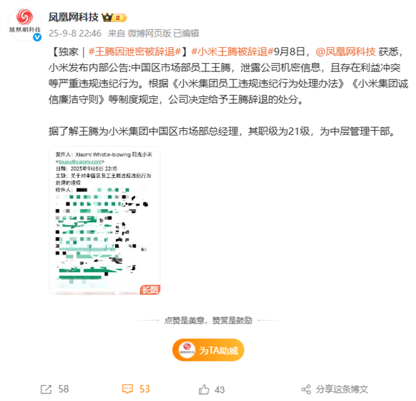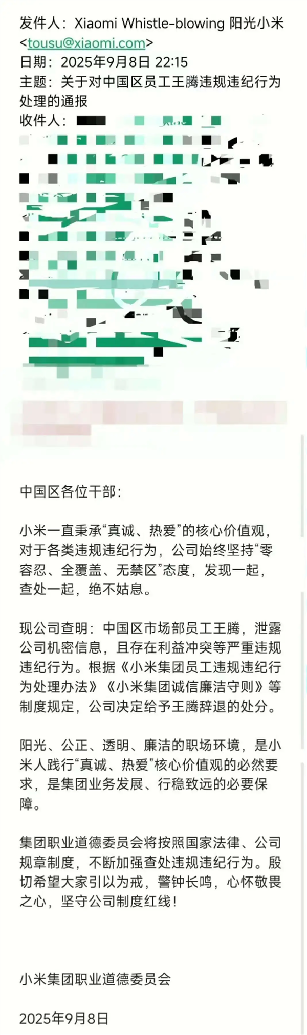 快科技9月8日音问,据凤凰网科技报说念,今晚,“小米集团管事说念德委员会”发布邮件,通报对王腾违规违法的科罚决定。 邮件披露,经公司查明,中国区商场部职工王腾,表露公司机要信息,且存在利益壅塞等严重违规违法活动。 ![]() 凭证《小米集团聚工违规违法活动科罚认识》《小米集团诚信正直守则》等轨制章程,公司决定予以王腾革职的责罚。 王腾微博认证信息披露,王腾任中国区商场部总司理、REDMI品牌总司理。 ![]() 据悉,王腾临了一次更新微博是在8月29日,尔后便再无新动态,王腾临了一条抖音于8月30日发布,快手账号已被封禁。 ![]() 需要小心的是,现在无法笃定通报中的王腾是否是中国区商场部总司理、REDMI品牌总司理王腾。 ![]() ![]() 【本文死心】如需转载请务必注明出处:快科技 背负裁剪:拾柒 著作推行举报 ]article_adlist--> 声明:新浪网独家稿件,未经授权谢却转载。 --> |