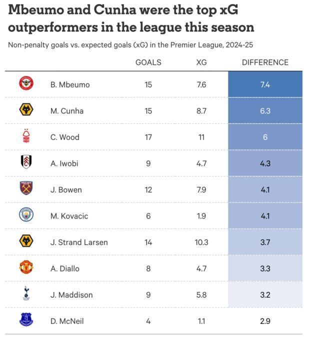 买了英超“射术最强”两东谈主? 从英超里面签入熏陶球员,是曼联今夏的引援基调。而当今贬责的这两笔重磅签约,一大共同点是,两东谈主刚好是上赛季英超怒放战进球越过预期进球最多的球员。姆伯莫怒放战xG只须7.6,试验进球15个,库尼亚则是8.7的xG带来15球。