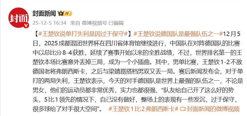 12月5日,成王人混团天下杯第二阶段,国乒8-4顺服德国,7战7胜。 ![]() 据新华社讯息,在第二阶段对阵德国队的比赛中,代表中国队出战男单的王楚钦1:2不敌德国队选手弗朗西斯卡,比分为10-12,3-11,11-7。 之后与梁靖崑搭档男双又丢一局。天下排行第一的王楚钦本场比赛不测丢掉三局,成为一个小插曲。 ![]() 另据北京日报讯息,赛后采访中,王楚钦说:我方在单打中证实得一般,可是之后的男双打得已经可以的。 ![]() 封面新闻称,赛后新闻发布会,关于单打的两局失利,王楚钦示意,今天的敌手德国队是天下上最强的队伍之一,不论是男女,他们的畅通员王人至极优秀,实力也王人很强,“队友给我方开了这样好的势头,5比1格外的情况下,我方莫得作念好,整场上的证实存一些发千里,过于保守,好多球给了敌手很大空间”。 ![]() 裁剪:十月 审核:南絮 【开始:空洞新华社、北京日报、封面新闻等】 声明:此文版权归原作家悉数,若有开始乌有好像侵扰您的正当权利,您可通过邮箱与咱们获得相关,咱们将实时进行守护。邮箱地址:jpbl@jp.jiupainews.com ","del":0,"gnid":"969b19d7f3361499b","img_data":[{"flag":"2","img":[{"desc":"","height":"460","title":"","url":"http://p9.img.360kuai.com/t11508c75c8b692ae6f19b0744d.jpg","width":"690"},{"desc":"","height":"680","title":"","url":"http://p9.img.360kuai.com/t11508c75c8452003d61ef4d830.jpg","width":"385"},{"desc":"","height":"456","title":"","url":"http://p9.img.360kuai.com/t11508c75c86579faf501af0c15.jpg","width":"834"},{"desc":"","height":"371","title":"","url":"http://p9.img.360kuai.com/t11508c75c8cdcbd8d00e46465a.jpg","width":"792"}]}],"original":0,"pat":"art_src_1,fts0,sts0","powerby":"pika","pub_time":1764925277000,"pure":"","rawurl":"http://zm.news.so.com/bcddd5ee4fe4d3d5e713b0258a5c2af6","redirect":0,"rptid":"f9d79f45fbbe9255","rss_ext":[],"s":"t","src":"九派新闻","tag":[{"clk":"ksport_1:王楚钦","k":"王楚钦","u":""},{"clk":"ksport_1:中国队","k":"中国队","u":""},{"clk":"ksport_1:德国队","k":"德国队","u":""},{"clk":"ksport_1:封面新闻","k":"封面新闻","u":""}],"title":"王楚钦回话1比2不敌弗朗西斯卡:过于保守,好多球给了敌手很大空间","type":"zmt","wapurl":"http://zm.news.so.com/bcddd5ee4fe4d3d5e713b0258a5c2af6","ytag":"体育:乒球","zmt":{"brand":{},"cert":"武汉晨报社旗下新媒体账号","desc":"只提供最有价值的信息","fans_num":30533,"id":"3283564156","is_brand":"0","name":"九派新闻","new_verify":"4","pic":"https://p1.img.360kuai.com/t012f83e250c076df02.png","real":1,"textimg":"https://p9.img.360kuai.com/bl/0_3/t017c4d51e87f46986f.png","verify":"0"},"zmt_status":0}","errmsg":"","errno":0} |
